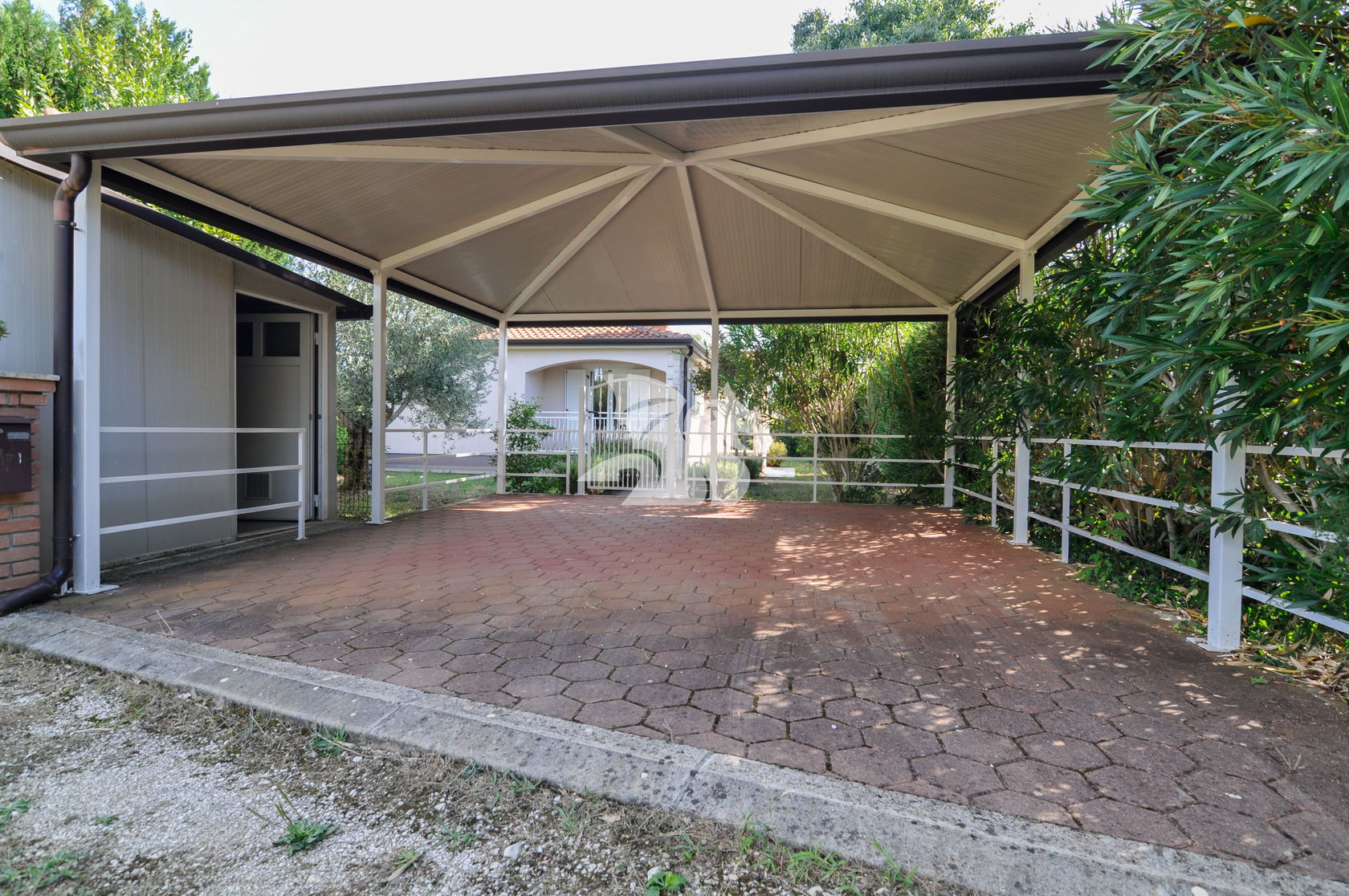 Pred hišo je pokrit dovoz z dvema parkirnima mestoma in vrtna uta.