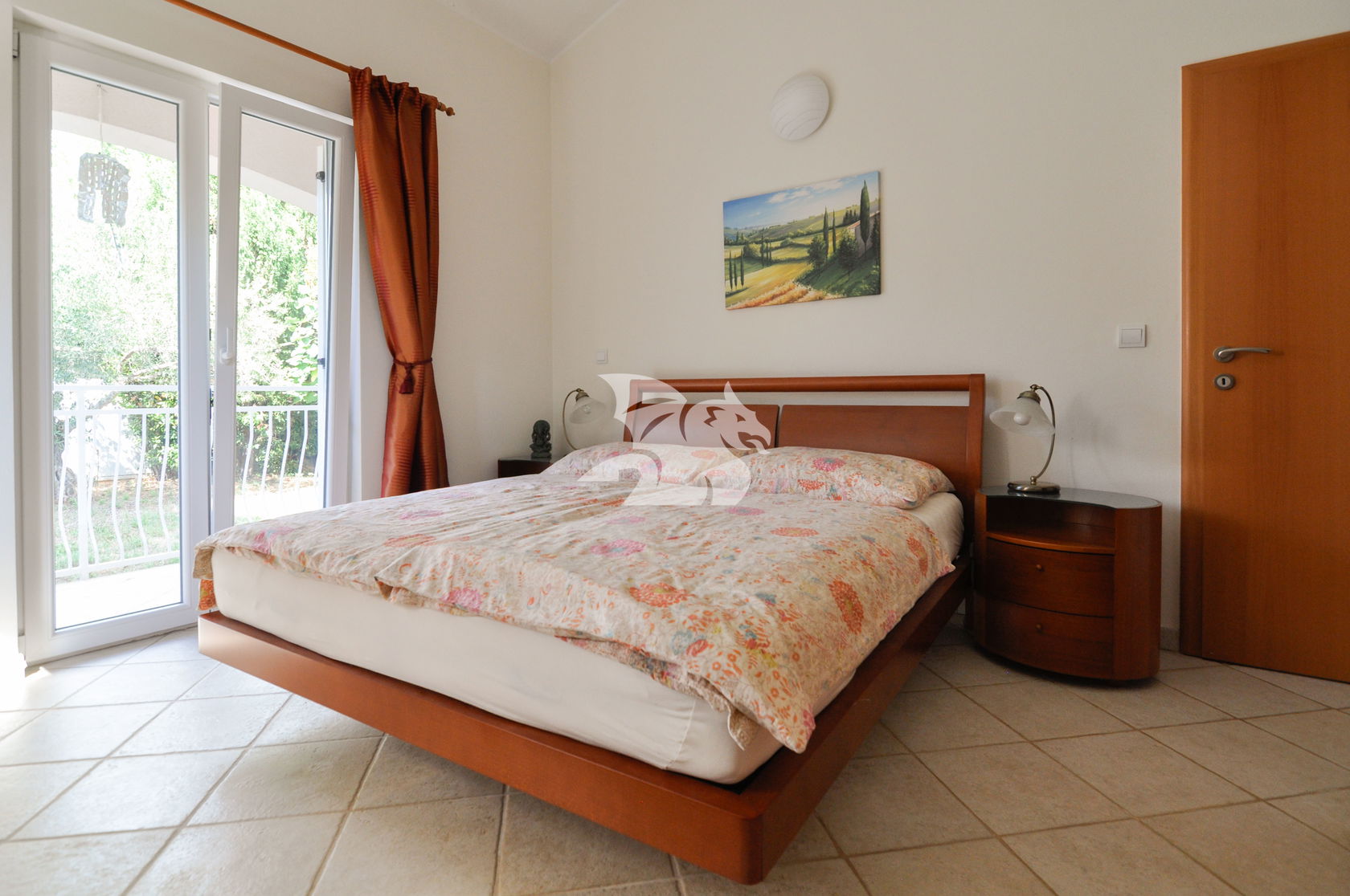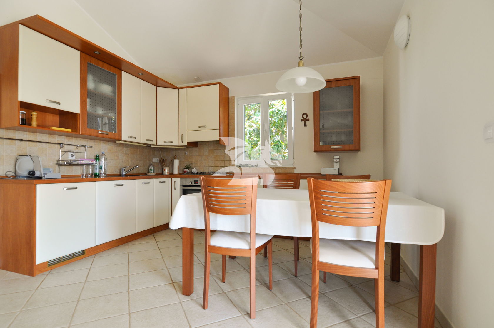 Tlorisno obsega predprostor, kuhinjo z jedilnico, svetlo dnevno sobo s kamnitim kaminom in izhodom na pokrito teraso s pogledom na bazen, dve spalnici (ena z izhodom na balkon) ter prostorno kopalnico z balkonskimi vrati in neposrednim dostopom na vrt – idealno pri uporabi bazena.