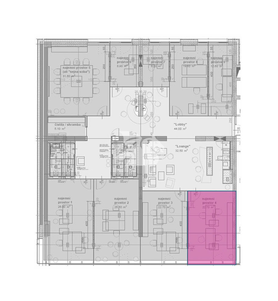 V medetaži stolpnice, kjer se nahaja pisarna, je urejen moderno zasnovan koncept pisarniških prostorov različnih velikosti. Razgibana zasnova omogoča souporabo skupnih prostorov (recepcija, lounge s kuhinjo, kopirnica, prostorna sejna soba in toalete).