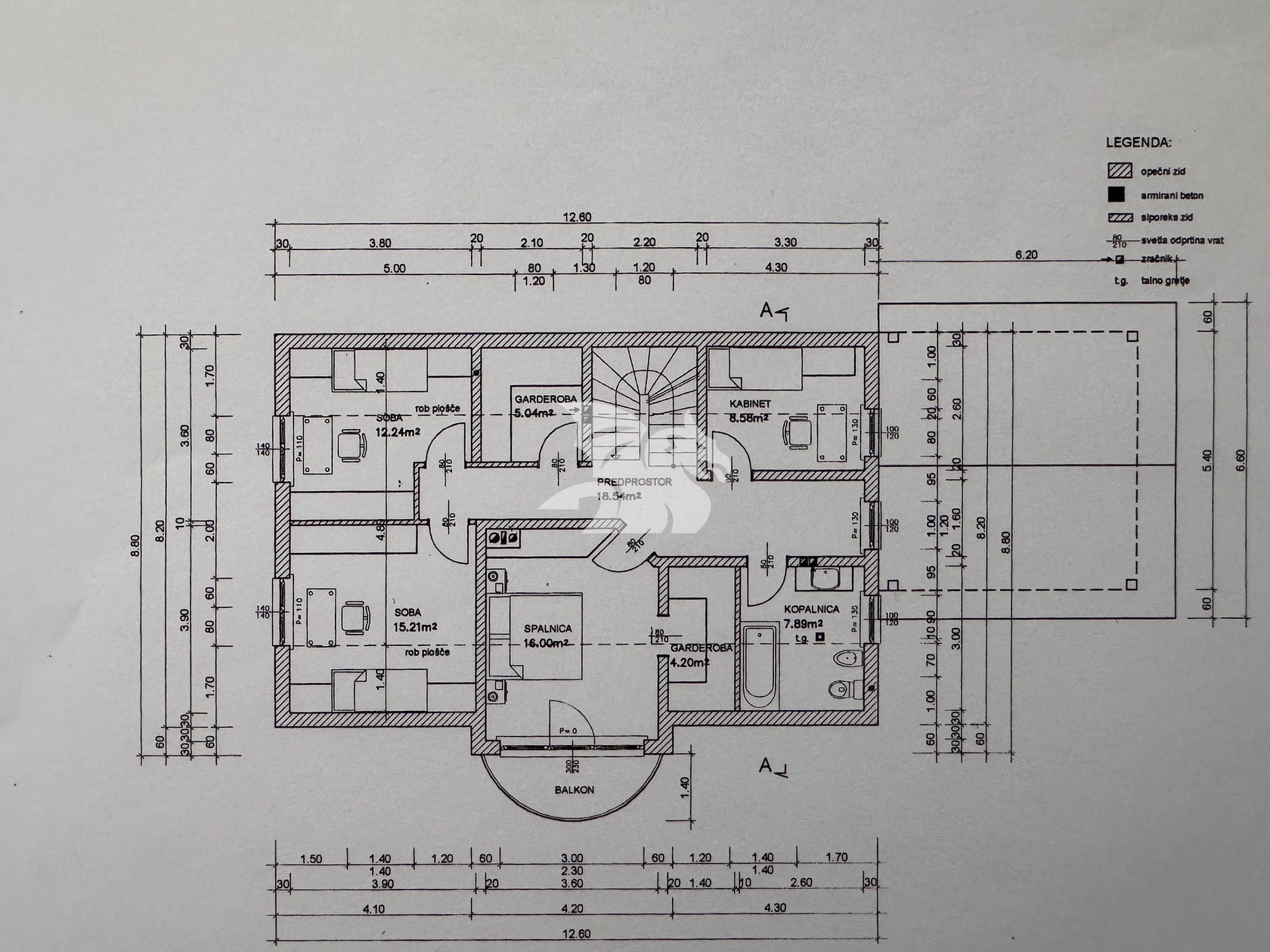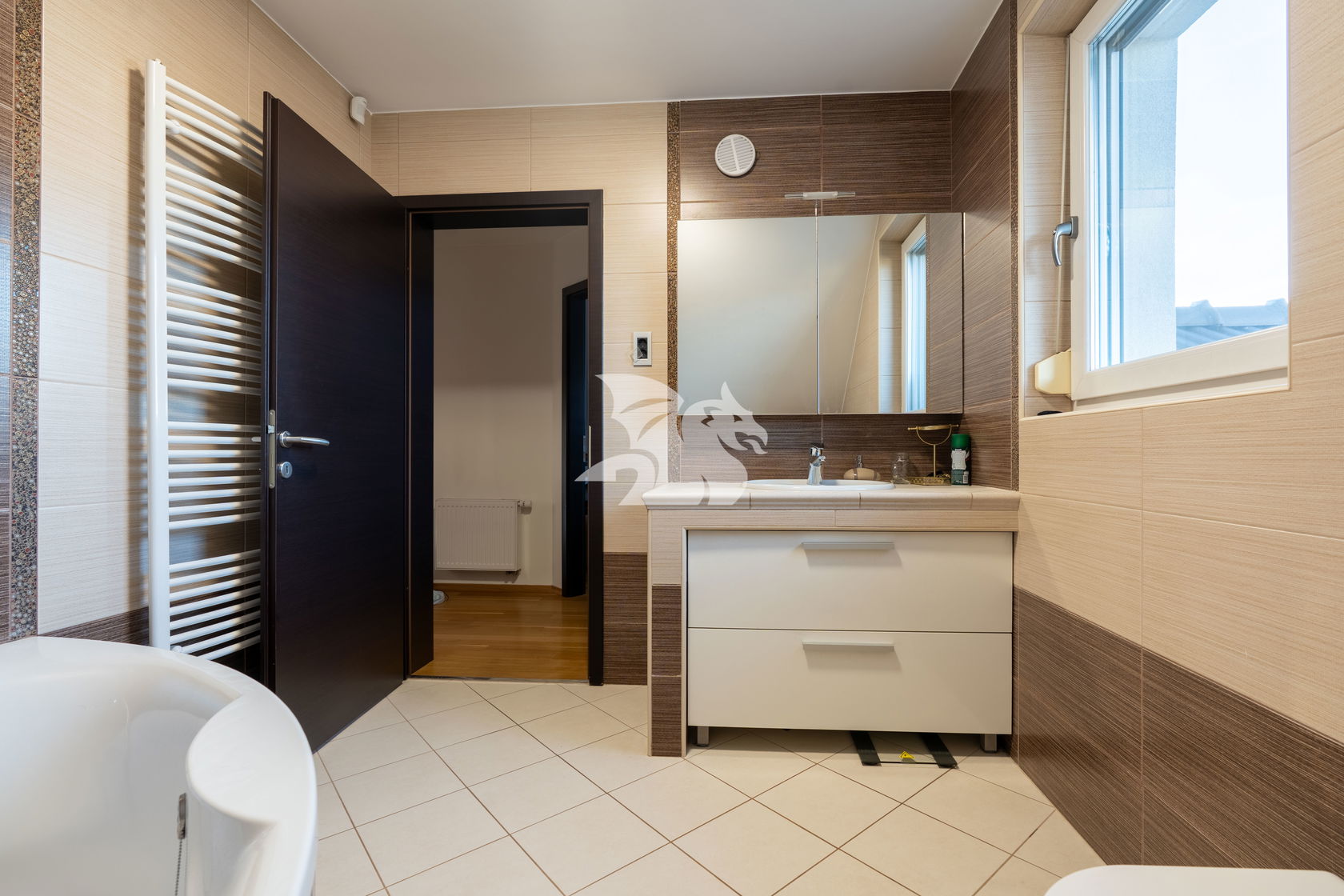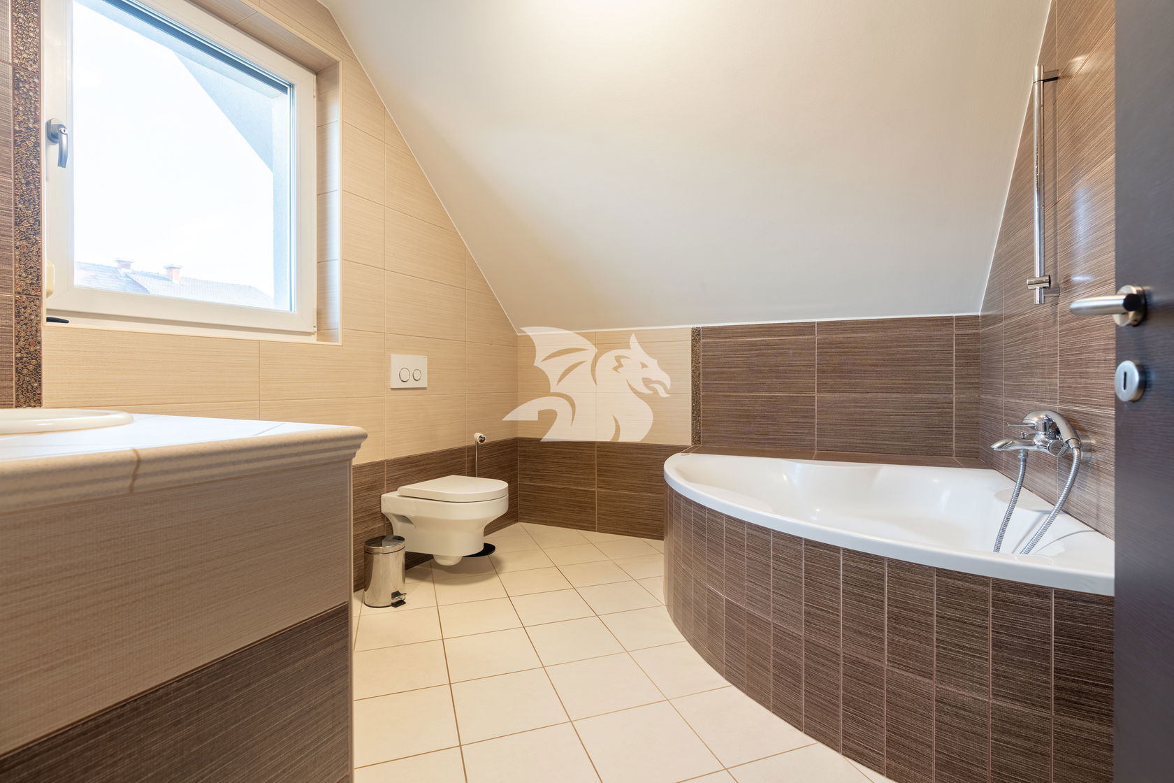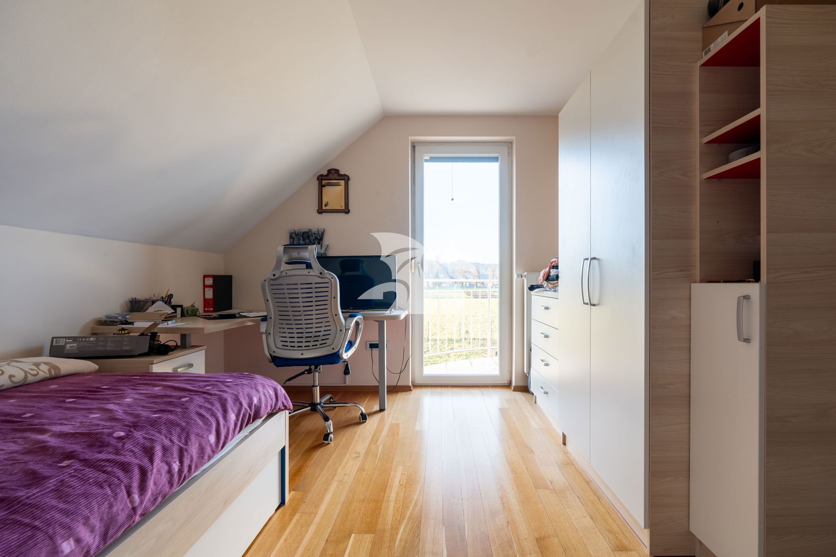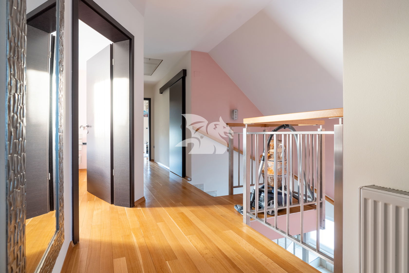 V prvem nadstropju so glavna spalnica z garderobo, dve otroški sobi (obe z izhodom na balkon), kabinet ter kopalnica s kadjo.