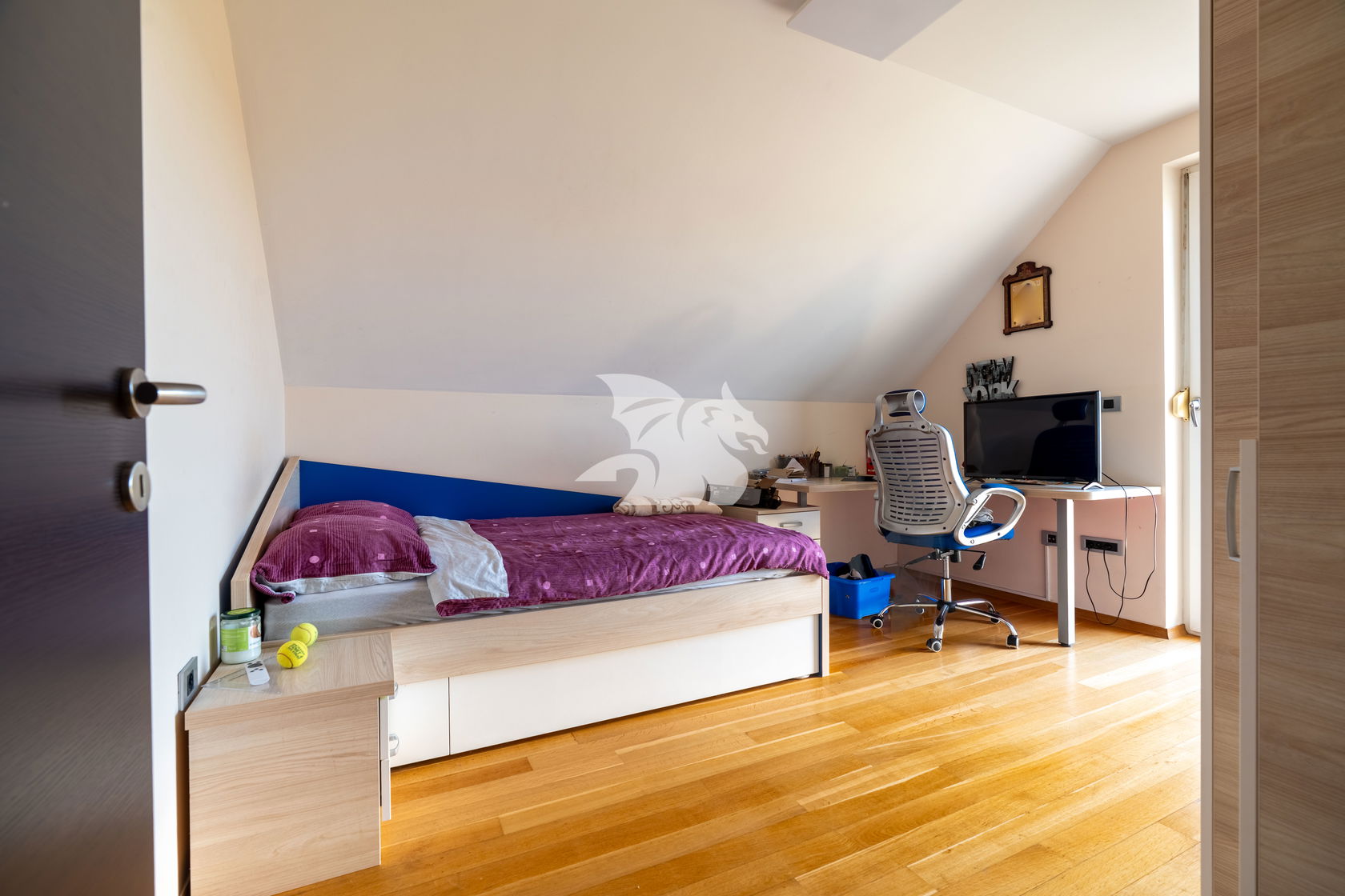 Mansarda je v celoti izdelana in zaključena, potrebno je le še položiti talne obloge, kar novemu lastniku omogoča, da si prostor uredi povsem po svojih željah (dodatne sobe, atelje, pisarna, igralnica …).