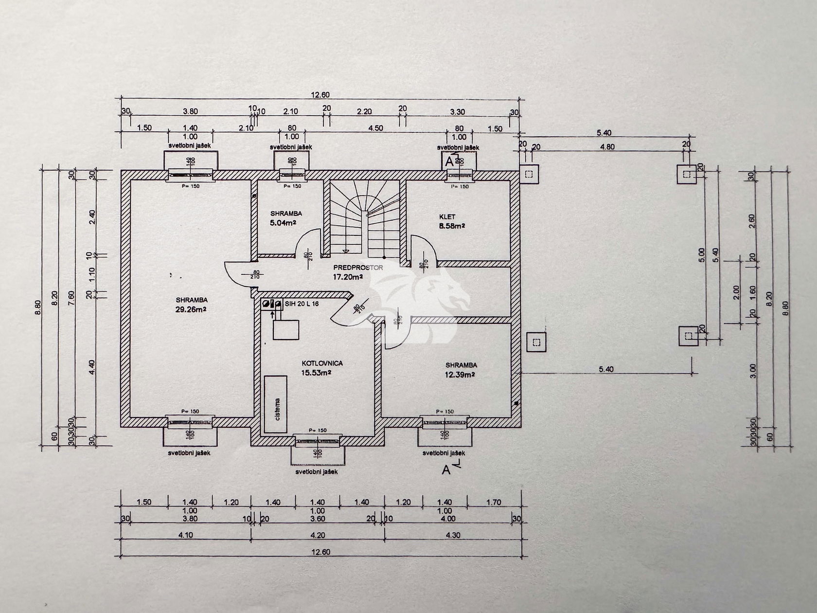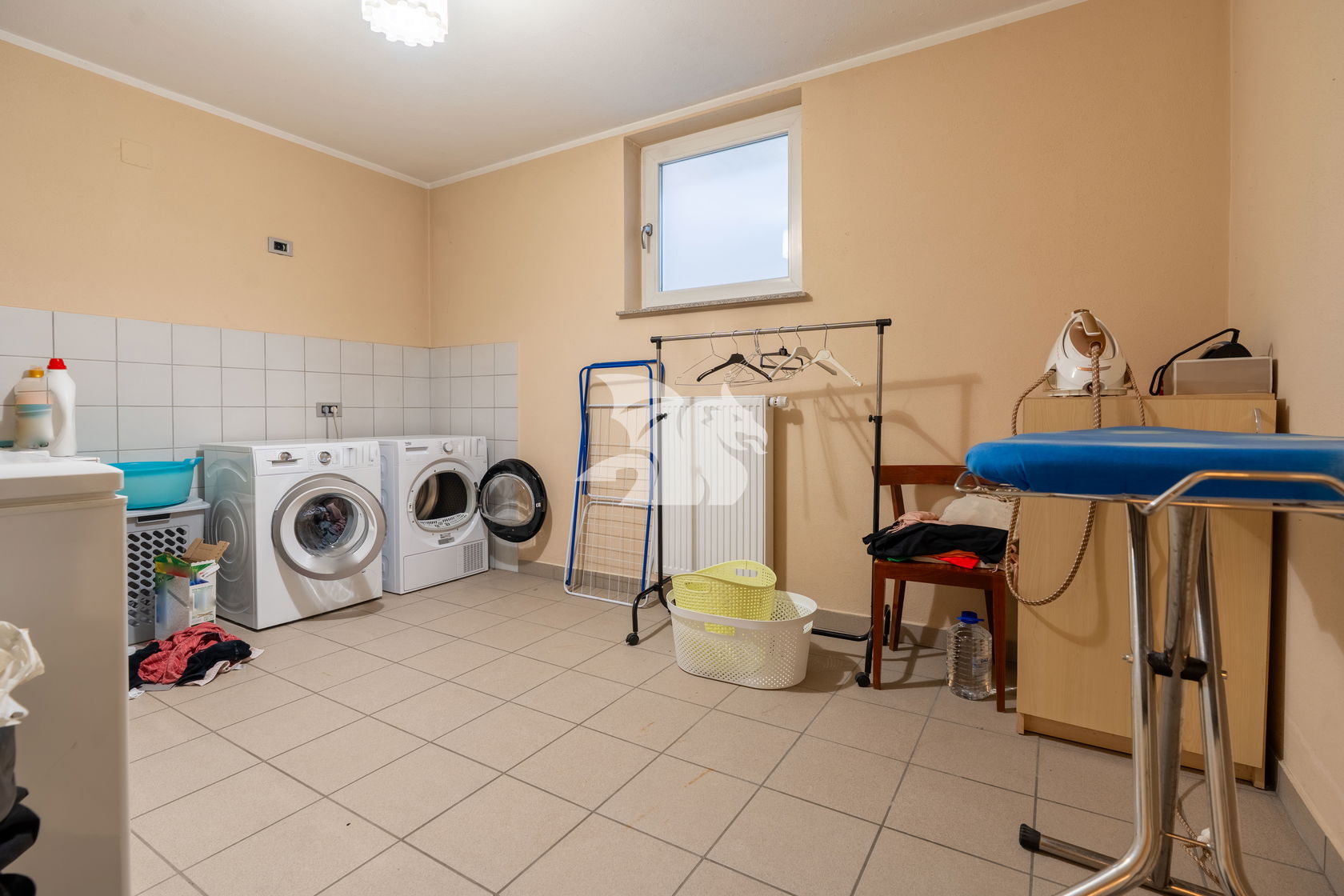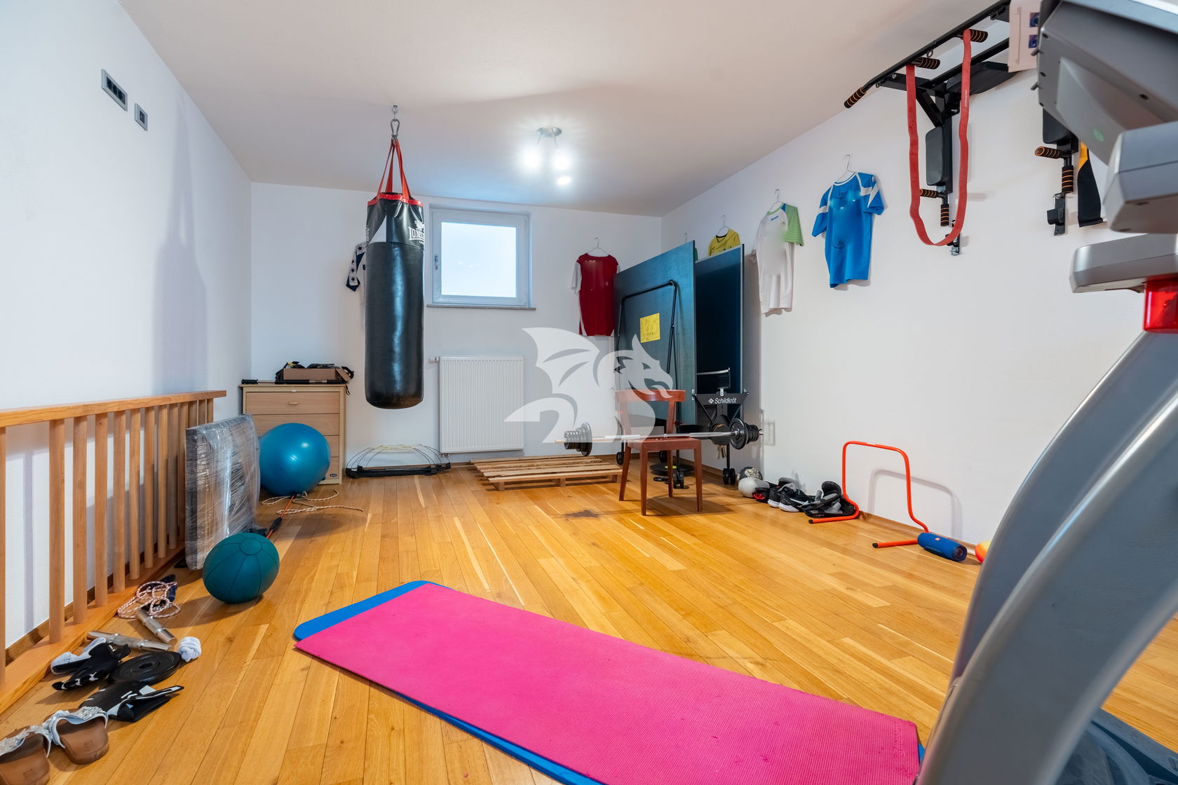 Kletna etaža obsega velik večnamenski prostor (trenutno urejen kot fitnes), utility, dve shrambi ter tehnični prostor oziroma kurilnico. Etaža je ogrevana z radiatorji in primerna tudi za bivanje ali ureditev dodatne stanovanjske enote.
