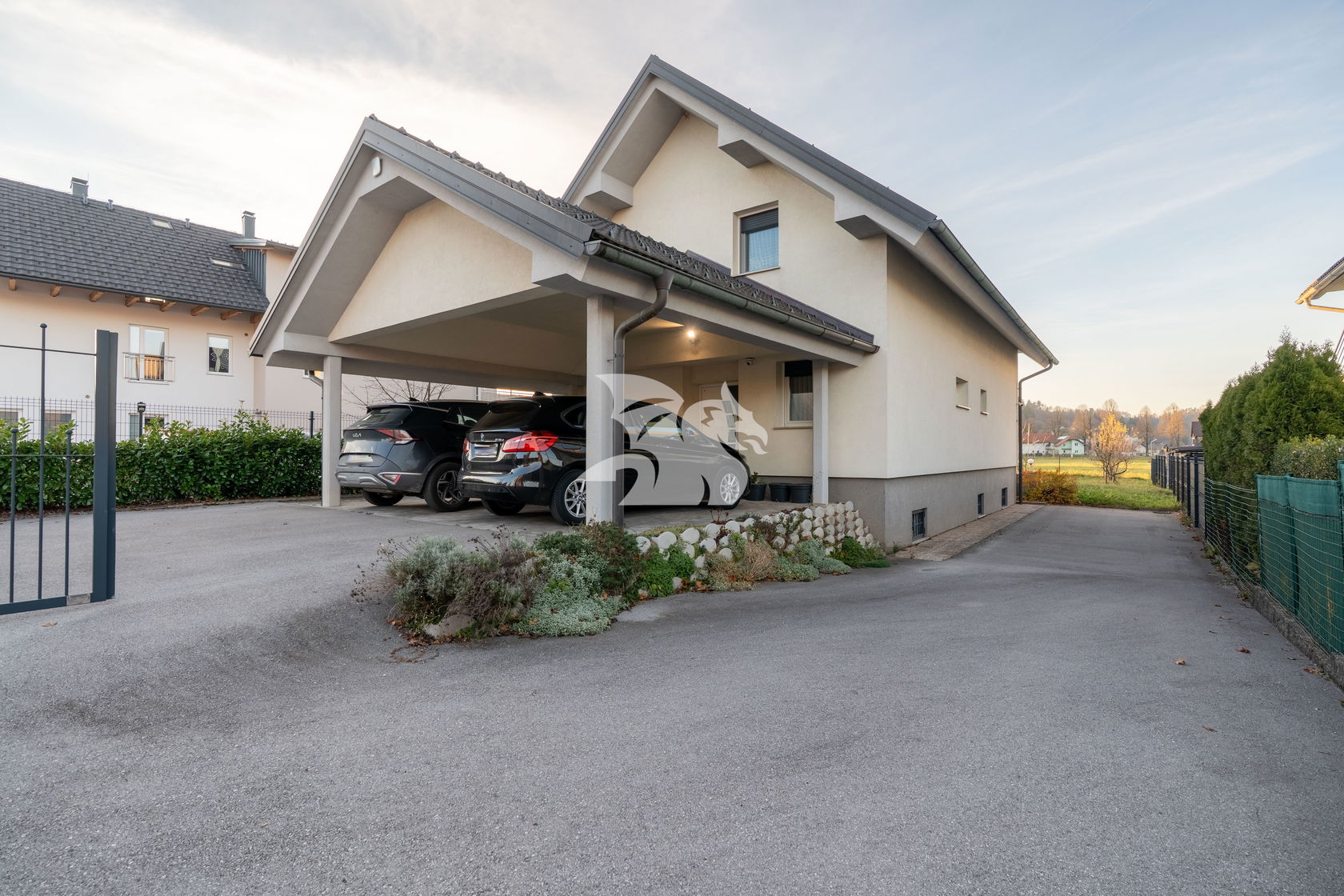 Pred hišo je tlakovano dvorišče z nadstreškom za dve vozili ter dodatnim parkirnim prostorom za še 3–4 avtomobile.