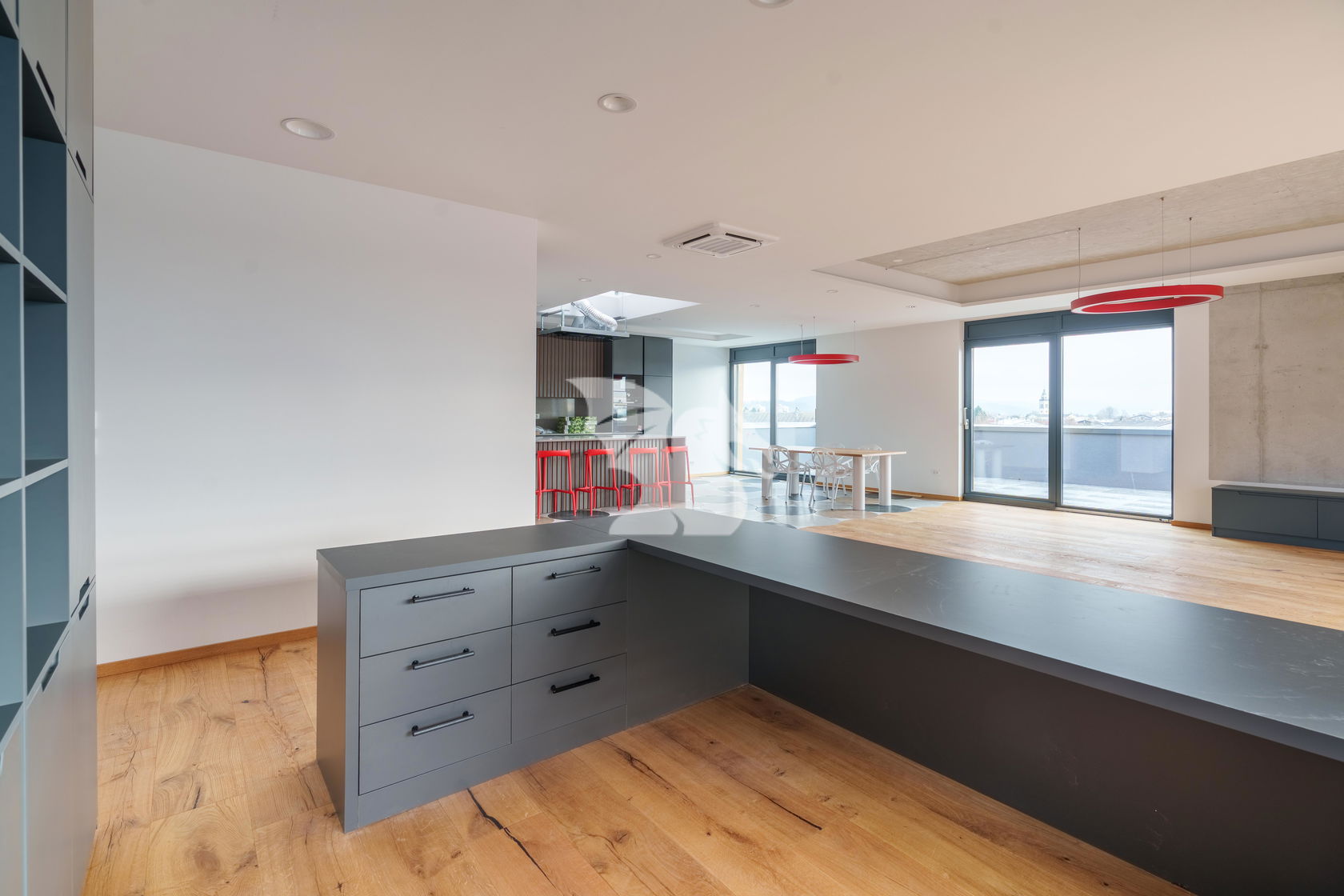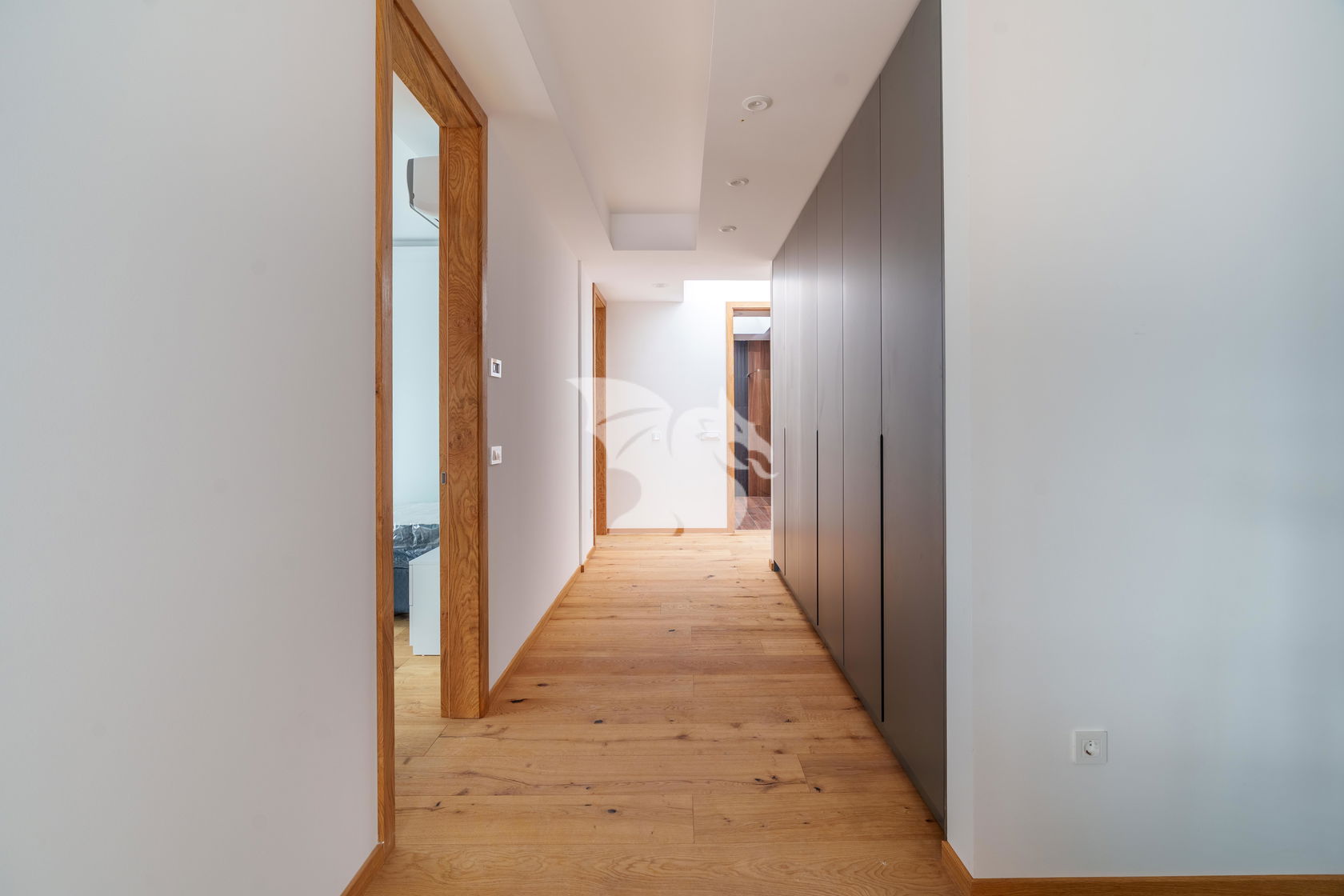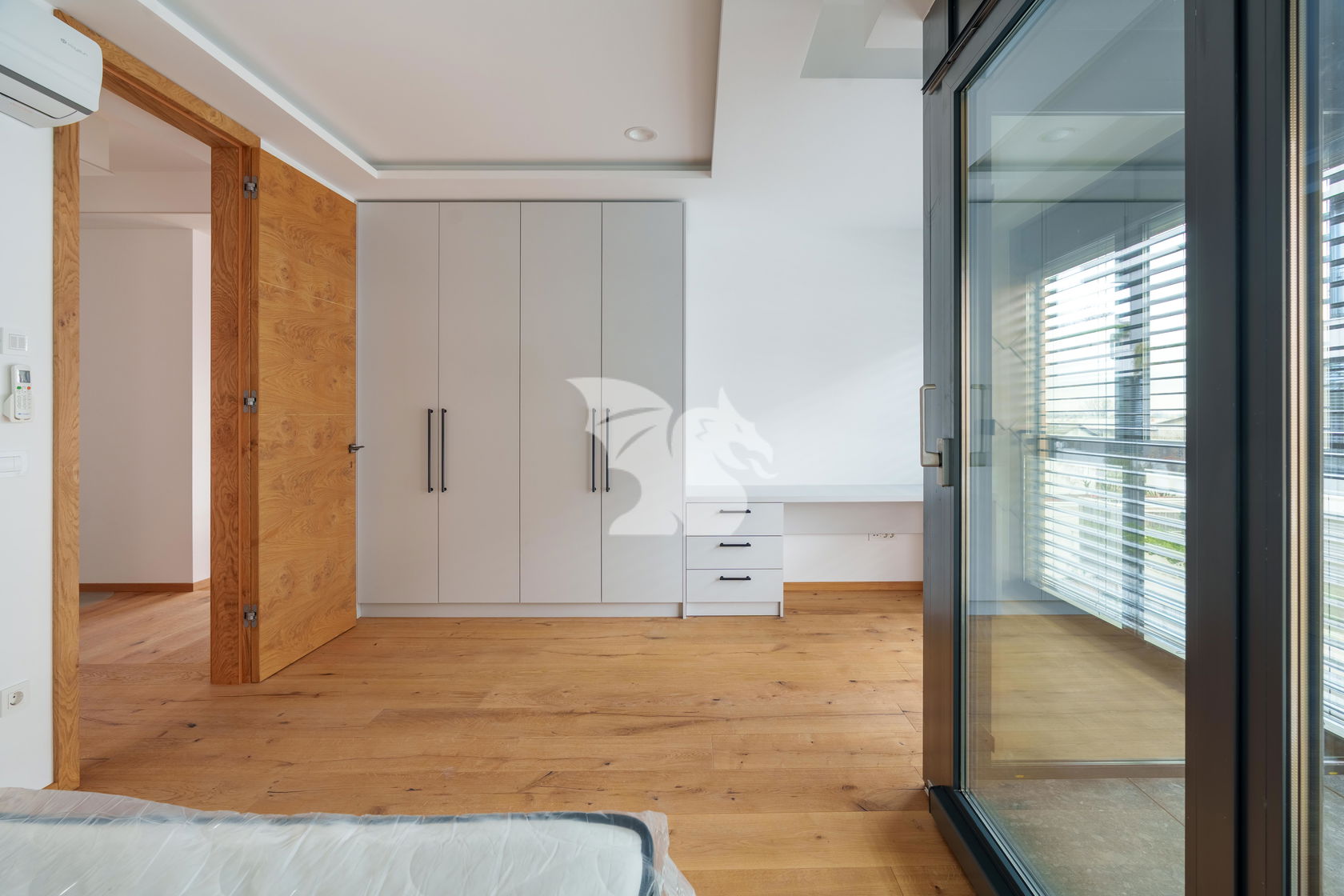 Tlorisno obsega predprostor, zelo prostoren dnevno bivalni del s kuhinjo in jedilnico v povezavi z dnevno sobo, z izhodom na zaprto ložo in teraso, glavno spalnico z lastno kopalnico in zaprto ložo, dve spalnici, obe z izhodom na lastno zaprto ložo, dodatno kopalnico s prho in kadjo ter ločeno dnevno toaleto. Stanovanje odlikuje funkcionalnost in dovršen dizajn, ki ustvarja maksimalno udobje in kvaliteto bivanja. Vsa oprema v stanovanju je višjega kakovostnega razreda in izdelana po meri.