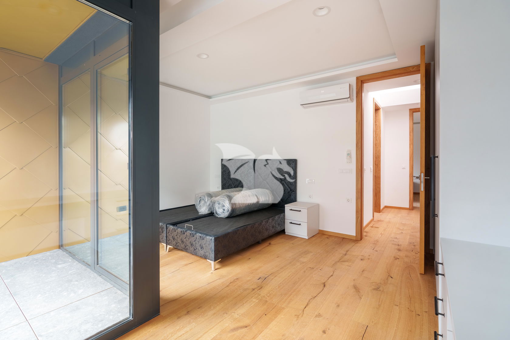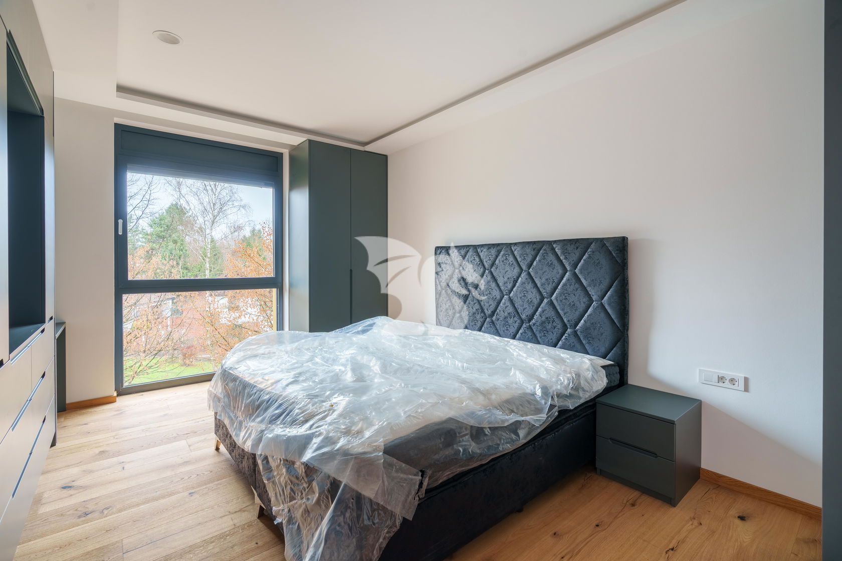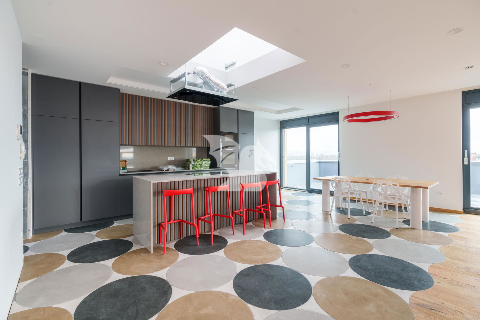 Tlorisno obsega predprostor, zelo prostoren dnevno bivalni del s kuhinjo in jedilnico v povezavi z dnevno sobo, z izhodom na zaprto ložo in teraso, glavno spalnico z lastno kopalnico in zaprto ložo, dve spalnici, obe z izhodom na lastno zaprto ložo, dodatno kopalnico s prho in kadjo ter ločeno dnevno toaleto. Stanovanje odlikuje funkcionalnost in dovršen dizajn, ki ustvarja maksimalno udobje in kvaliteto bivanja. Vsa oprema v stanovanju je višjega kakovostnega razreda in izdelana po meri.