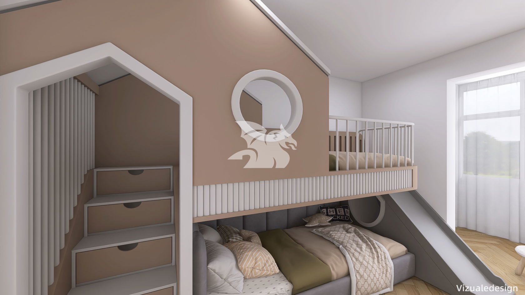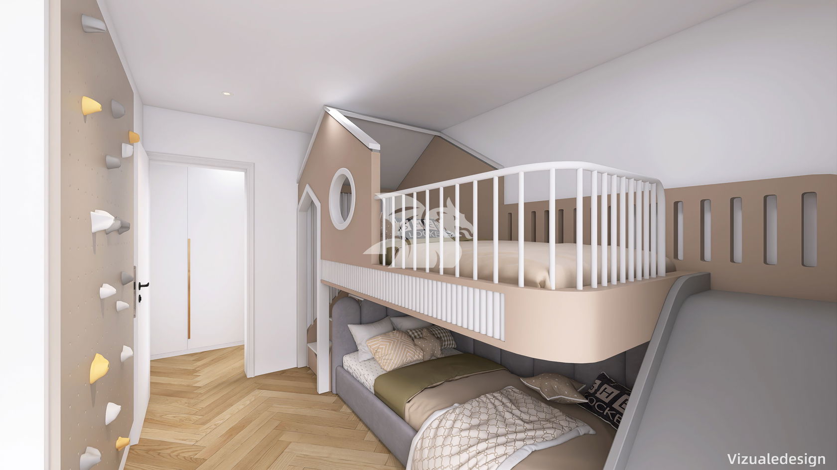Iz dnevne sobe vodijo stopnice v zgornjo etažo, ki obsega manjši hodnik, dve svetli spalnici, pri čemer je ena izmed njiju razširjena z zaprto loggio kot funkcionalnim podaljškom prostora, ter kopalnico.